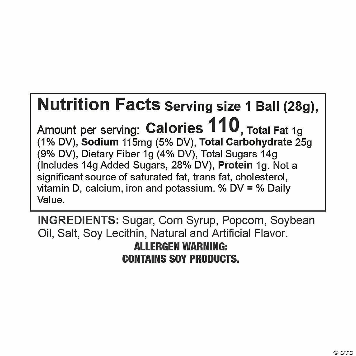 With a classic sweet and salty flavor, these classic popcorn balls make an excellent treat at any large event! Whether it’s a school carnival, a corporate meeting or a large party of any kind, this set of 100 popcorn balls is sure to please! Individually wrapped. (100 pcs. per unit) Total wt., 96 oz. Gluten-Free. Nut-Free.• Edibles are non-returnable. For more information, visit our “Return Policy” page located on our website. • Made in the USA. Important Country of Origin Information: For certain items sold by OTC on our Web or Mobile sites, country of origin information can change and what is displayed may not be accurate or consistent with manufacturer information. For up to date country of origin information, it is recommended that you rely on product packaging or other manufacturer information.• Ingredient, nutrition, allergen and other product information are provided on our Web and Mobile sites for reference purpose only, without warranty or representation as to accuracy. Manufacturers adjust their labeling regularly and are solely responsible for the accuracy of the information. For general questions concerning these items, please contact our customer service at 800-228-0475.