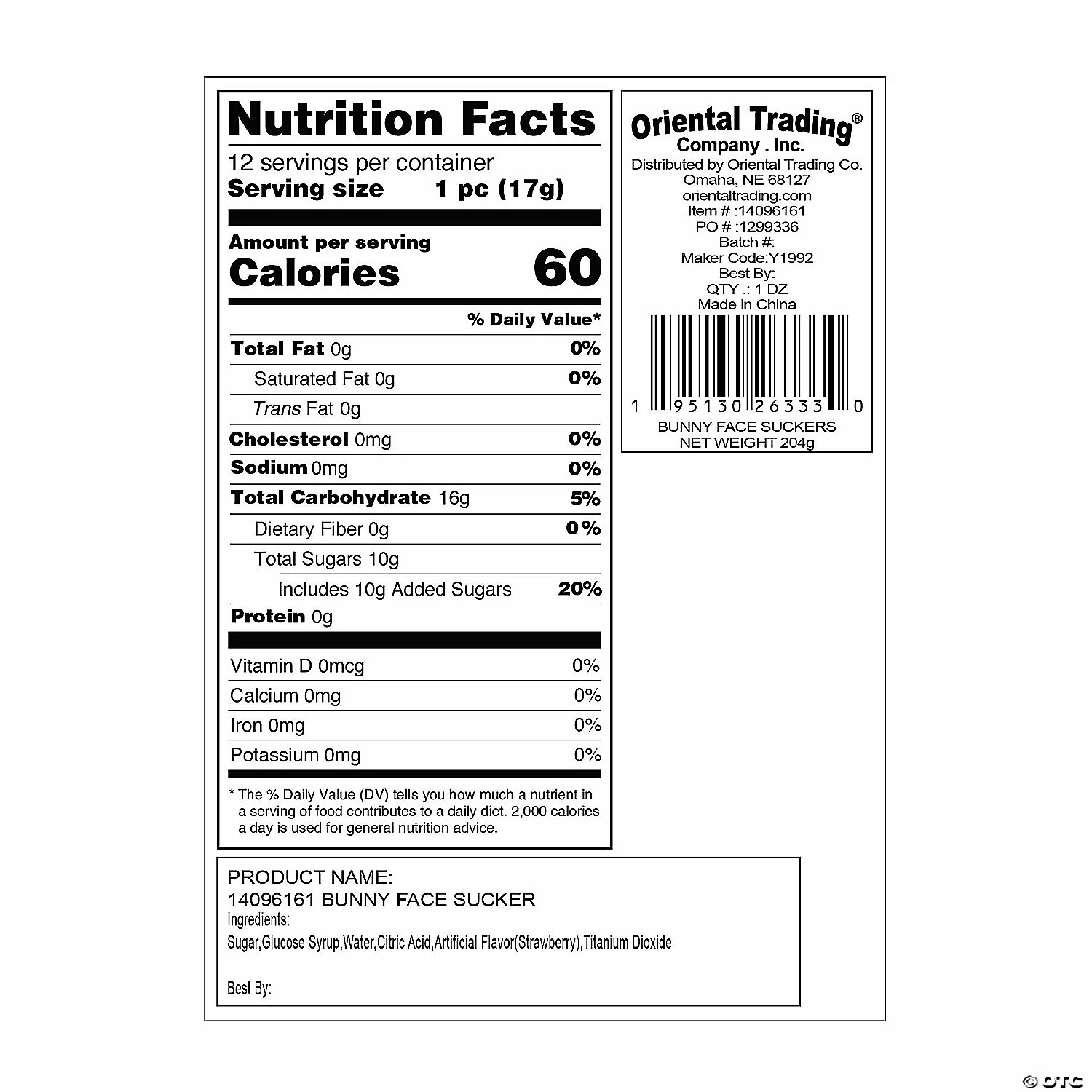 Make kids โhoppyโ with these yummy lollipops featuring the bottom half of a smiling bunnyโs face. Great for photos or to hand out at an Easter gathering, these strawberry-flavored lollipops are also great as Easter basket filler or to distribute as Easter egg hunt prizes. These fat-free lollipops will get kids hopping with joy! Strawberry flavor. Individually wrapped. 2″ lollipop on a 4″ plastic stick. Fat-free. Total wt., 7 oz.โข Candy is non-returnable. For more information, visit our โReturn Policyโ page located on our website.โข Ingredient, nutrition, allergen and other product information are provided on our Web and Mobile sites for reference purpose only, without warranty or representation as to accuracy. Manufacturers adjust their labeling regularly and are solely responsible for the accuracy of the information. For general questions concerning these items, please contact our customer service at 800-228-0475.