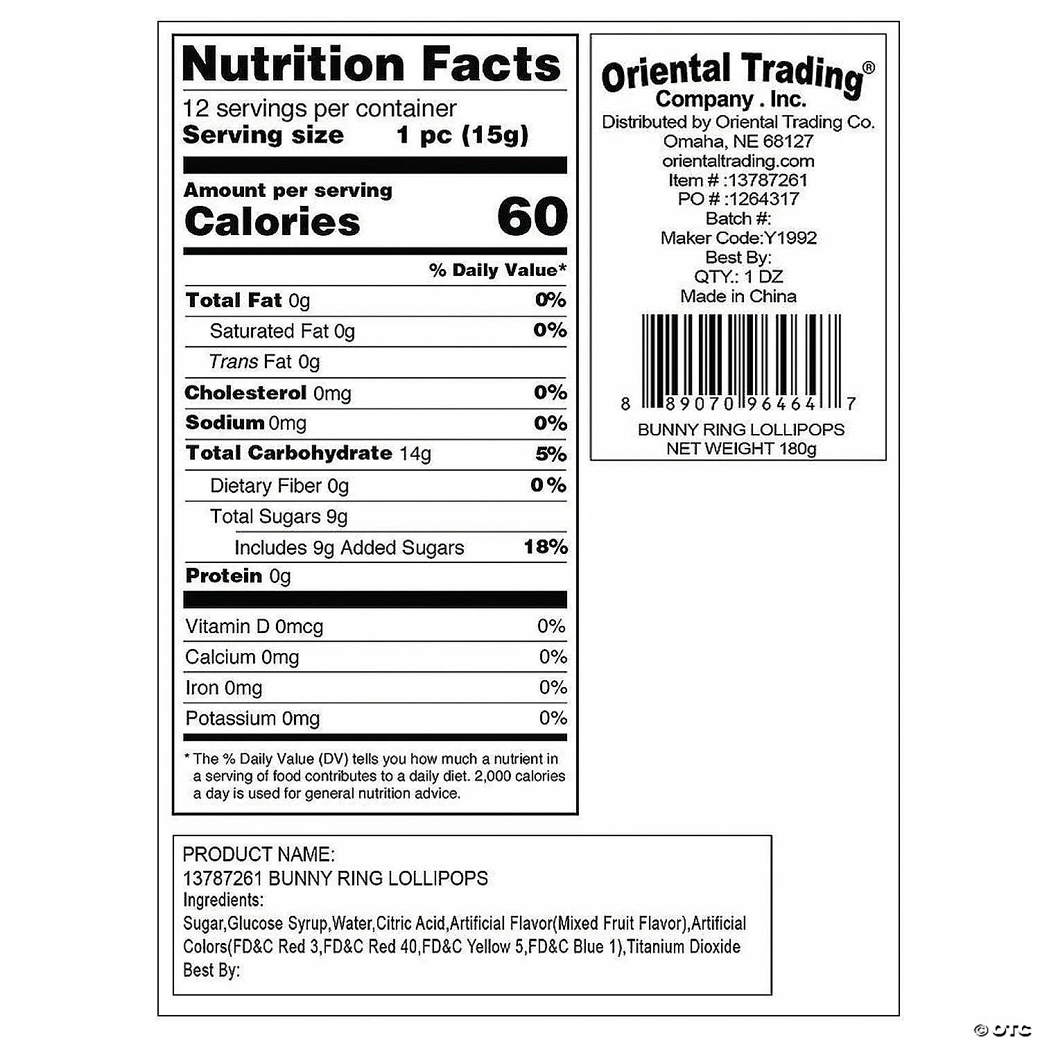 These hoppy accessories are a sweet treat for filling Easter baskets or tucking in plastic eggs for the Easter egg hunt. Mixed fruit flavor. 1 3/4″ pops on 1/2″ plastic rings. Total wt., 5 oz. Individually wrapped. Fat-free.โข Candy is non-returnable. For more information, visit our โReturn Policyโ page located on our website.โข Ingredient, nutrition, allergen and other product information are provided on our Web and Mobile sites for reference purpose only, without warranty or representation as to accuracy. Manufacturers adjust their labeling regularly and are solely responsible for the accuracy of the information. For general questions concerning these items, please contact our customer service at 800-875-8494.