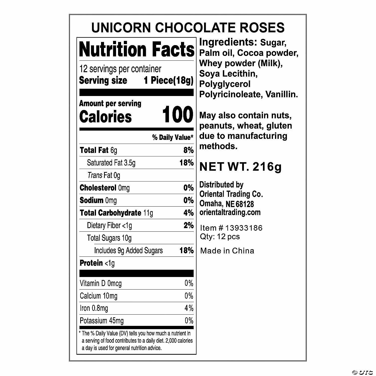 Chocolate + Roses = classic Valentine’s Day gifts and favors! Combine the two valentine favorites with these chocolate roses. Each rose features an iridescent wrap reminiscent of mermaids and unicorns! Create a chocolate rose bouquet for a special someone or hand each one out individually. Individually foil-wrapped. Each 2″ chocolate hollow rose is on a 14″ plastic stem. Total wt., 7 oz.โข Candy is non-returnable. For more information, visit our โReturn Policyโ page located on our website.โข Ingredient, nutrition, allergen and other product information are provided on our Web and Mobile sites for reference purpose only, without warranty or representation as to accuracy. Manufacturers adjust their labeling regularly and are solely responsible for the accuracy of the information. For general questions concerning these items, please contact our customer service at 800-228-0475.