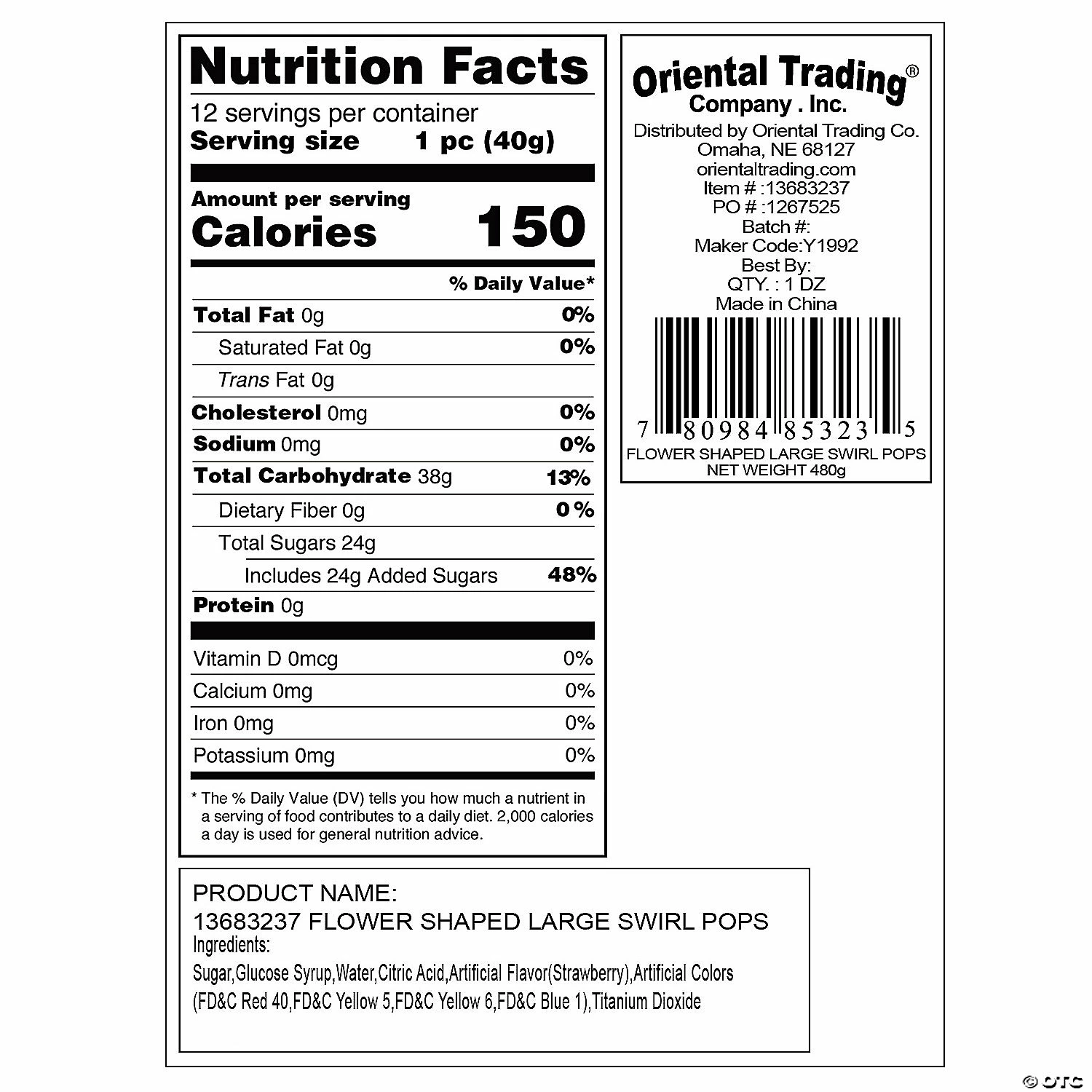Pick flower pops for delicious party favors or springtime giveaways! Plant the flowers in a vase on your candy buffet for visual interest and a pop of spring color. Featuring a sweet swirl pattern, these flower lollipops are a tasty treat, anytime. © OTC• Strawberry flavored.• Individually wrapped.• Includes 3″ suckers on 6″ plastic sticks.• Total wt., 1 lb. • Assortment may vary. • Fat-free.• Candy is non-returnable. For more information, visit our “Return Policy” page located on our website. • Ingredient, nutrition, allergen and other product information are provided on our Web and Mobile sites for reference purpose only, without warranty or representation as to accuracy. Manufacturers adjust their labeling regularly and are solely responsible for the accuracy of the information. For general questions concerning these items, please contact our customer service at 800-228-0475.