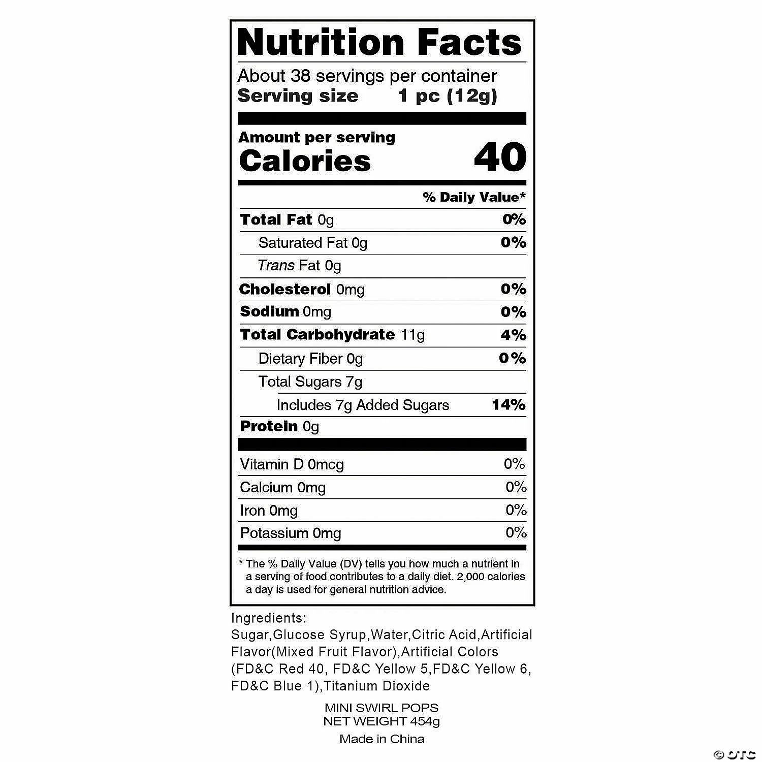 โข What’s Included: You get 38 individually wrapped, rainbow swirled mini lollipops in a mixed fruit flavor. โข Non-Returnable: Candy is non-returnable. For more information, visit the Return Policy page located on our website.โข Important Country of Origin Information: For certain items sold by OTC on our Web or Mobile sites, country of origin information can change and what is displayed may not be accurate or consistent with manufacturer information. For up to date country of origin information, it is recommended that you rely on product packaging or other manufacturer information.โข Product Information: These swirled lollipops are fat-free. Details about ingredients, nutrition, allergens and other product information are provided on our Web and Mobile sites for reference purpose only, without warranty or representation as to accuracy. Manufacturers adjust their labeling regularly and are solely responsible for the accuracy of the information. For general questions concerning these items, please contact our customer service at 800-228-0475.Product Description: Sweet old fashioned charm! Vibrant rainbow colors make these mini swirl lollipops a timeless favorite. While the mixed fruit flavor is delicious, these lollipops are so pretty you’ll want to display them in glass jars to decorate a carnival birthday party or a candy buffet at your wedding reception. You get 38 individually wrapped mini lollipops on plastic sticks so there’s enough for everyone to enjoy.Specs:Size: 1 1/2″ lollipop, 3 3/4″ stickQuantity: 1 lb., 38 lollipopsDietary needs: Fat-free