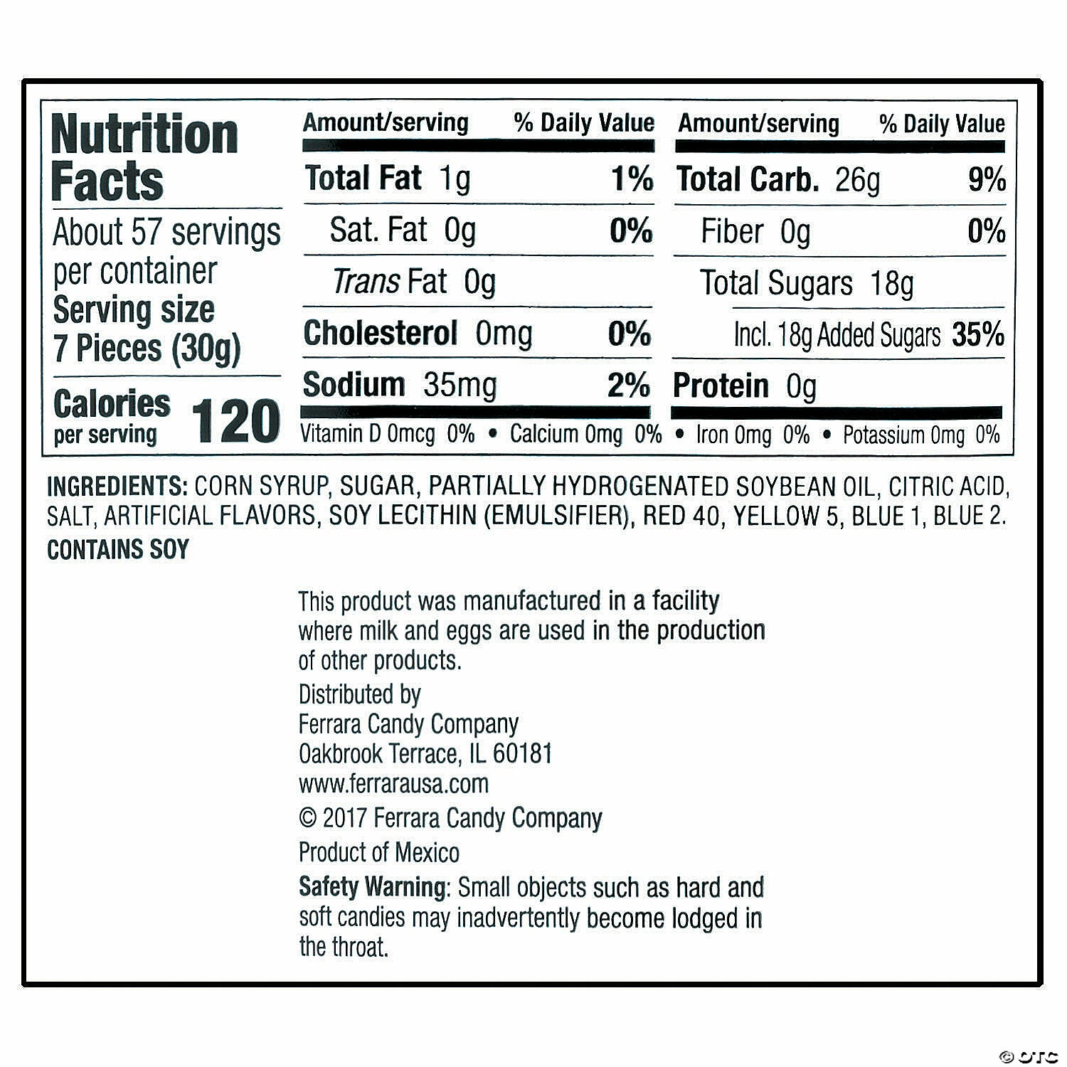 • What’s Included: You get 400 individually wrapped Now & Later® chews in a reusable plastic jar. The original mix includes apple, grape, cherry, banana and strawberry flavored candy chews.• Non-Returnable: Candy is non-returnable. For more information, visit the Return Policy page located on our website.• Important Country of Origin Information: Made in the U.S.A. For certain items sold by OTC on our Web or Mobile sites, country of origin information can change and what is displayed may not be accurate or consistent with manufacturer information. For up to date country of origin information, it is recommended that you rely on product packaging or other manufacturer information.• Product Information: Now & Later® fruit chews are gluten-free. Details about ingredients, nutrition, allergens and other product information are provided on our Web and Mobile sites for reference purpose only, without warranty or representation as to accuracy. Manufacturers adjust their labeling regularly and are solely responsible for the accuracy of the information. For general questions concerning these items, please contact our customer service at 800-228-0475.Product Description: Enjoy them now and later! The Now & Later® candy jar comes filled with 400 tasty and tart candy chews. A Halloween favorite for years, everyone will be happy if you hand out these long lasting chews to trick-or-treaters. They’re equally as popular as Easter candy treats, birthday party favors, and as event giveaways and rewards. Stash the jar in your desk drawer so you can always keep your office candy dish filled.Specs:Size: 3 lbs. 12 oz.Quantity: 400Dietary needs: Gluten-free