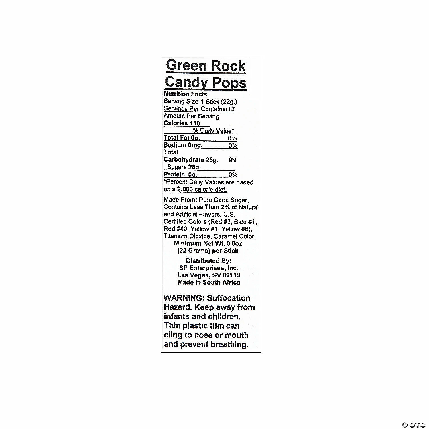 Everyone loves these nostalgic lollipops! No candy buffet will be complete without these sugary treats. From wedding receptions to birthday parties to office picnics, these Rock Candy Pops are a great way to add a unique look and burst of color to any occasion. Green apple flavor. Each 4 1/2″ sucker is on a 3″ wooden stick. Individually wrapped. Total wt., 9 oz.• Dairy-free.• Fat-free.• Gluten-free.• Candy is non-returnable. For more information, visit our “Return Policy” page located on our website.• Ingredient, nutrition, allergen and other product information are provided on our Web and Mobile sites for reference purpose only, without warranty or representation as to accuracy. Manufacturers adjust their labeling regularly and are solely responsible for the accuracy of the information. For general questions concerning these items, please contact our customer service at 800-228-0475.