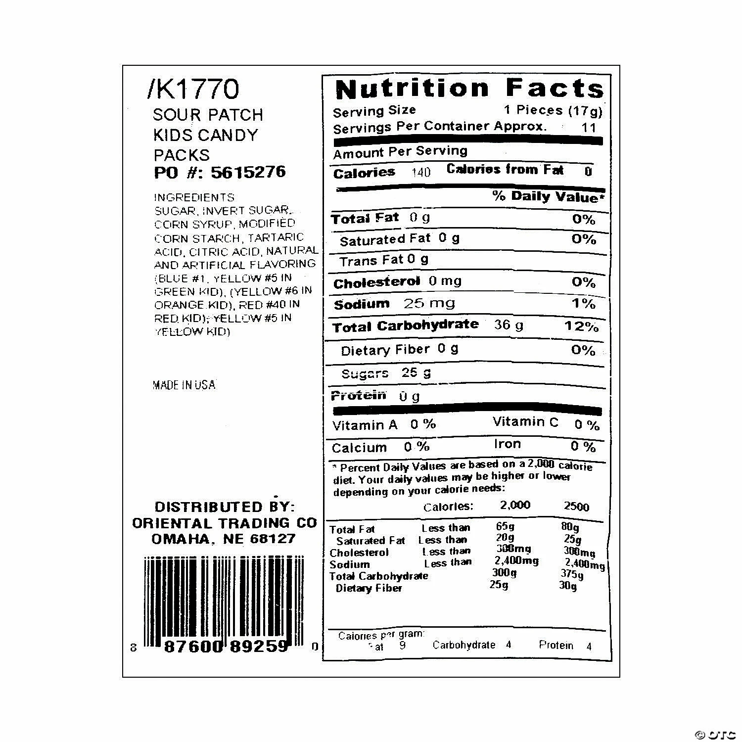 You’ll want to get your hands on these delicious candy packs! After all, who wouldn’t want to treat kids (or adults with a sweet tooth) to a sweet favorite like this? These super-popular Sour Patch Kids® Candy Packs are fun for party treat bags or an any day sugary surprise. • Assorted sour fruit flavors. • Individually wrapped. • (Approx. 80 pcs. per unit) • Total wt., 1 lb. • Fat-free.• Gluten-free.• Candy is non-returnable. For more information, visit our “Return Policy” page located on our website.• Ingredient, nutrition, allergen and other product information are provided on our Web and Mobile sites for reference purpose only, without warranty or representation as to accuracy. Manufacturers adjust their labeling regularly and are solely responsible for the accuracy of the information. For general questions concerning these items, please contact our customer service at 800-228-0475.
