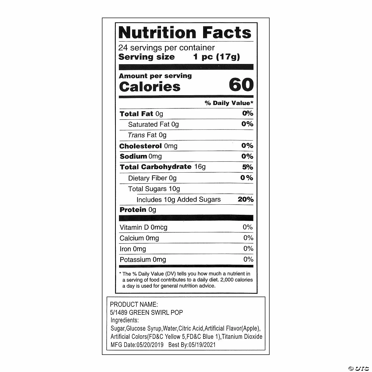 These suckers are a great treat to have around during wedding receptions, birthday parties, carnivals, fundraisers or wherever you need to brighten up your treat table or candy buffet! Sweet, tasty fun for both kids and adults! Apple flavor. Individually wrapped. Each 2″ pop is on a 4 1/2″ plastic stick. (2 dozen per unit) Total wt., 14 oz. Fat-free. Gluten-free. ยฉ OTCโข Candy is non-returnable. For more information, visit our โReturn Policyโ page located on our website.โข Ingredient, nutrition, allergen and other product information are provided on our Web and Mobile sites for reference purpose only, without warranty or representation as to accuracy. Manufacturers adjust their labeling regularly and are solely responsible for the accuracy of the information. For general questions concerning these items, please contact our customer service at 800-228-0475.